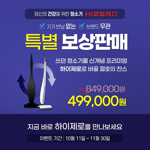 [시민일보 = 이승준 기자] 습식과 건식 청소가 동시에 가능한 무선물걸레청소기 ‘하이제로’의 한국 총판인 ‘하이제로코리아’에서 10월 11일부터 11월 30일까지 어떤 브랜드든 상관없이 모든 청소기 대상 보상판매 이벤트를 실시한다고 밝혔다.