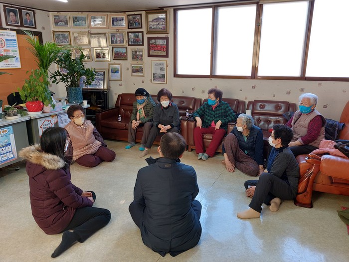 경기 동두천시 보산동행정복지센터가 최근 설 명절을 맞아 지역내 보산할머니경로당을 방문해 명절 인사 및 경로당 이용에 불편이 없는지 확인하는 시간을 보냈다. 사진은 동 관계자들이 경로당에서 노인들과 대화를 나누고 있는 모습. (사진제공=동두천시청)