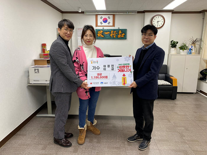 [시민일보 = 박준우 기자] 도봉구(구청장 오언석) 도봉1동은 최근 가수 이금, 여정인씨로부터 성금 118만6600원을 전달받았다고 18일 밝혔다.