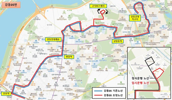 동시에 강동05번도 지하철 5호선 명일역, 상일동역 및 인근 주거단지(고덕래미안힐스테이트)와 연계가 가능해져, 출퇴근 시간대 지역 주민과 직장인들의 교통 편의가 대폭 향상될 것으로 기대된다.