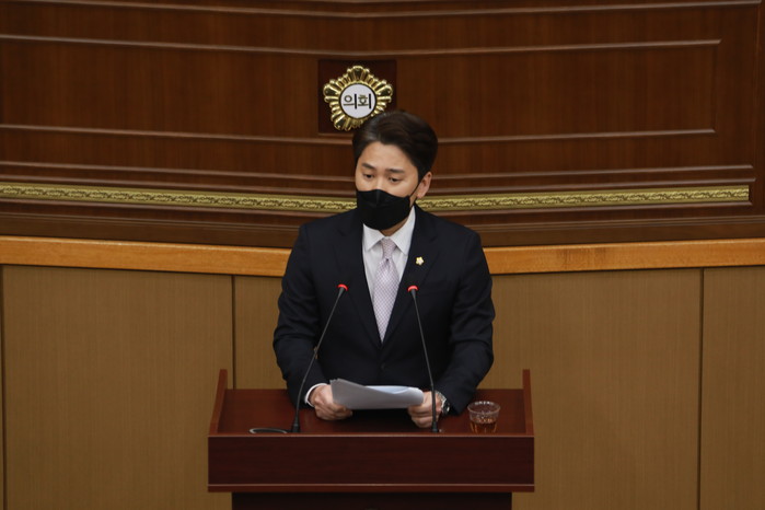 | ▲ 이민석 의원이 5분 발언을 통해 공무원의 정치적 중립의 중요성에 대해 발언하고 있다. (사진제공=마포구의회) |