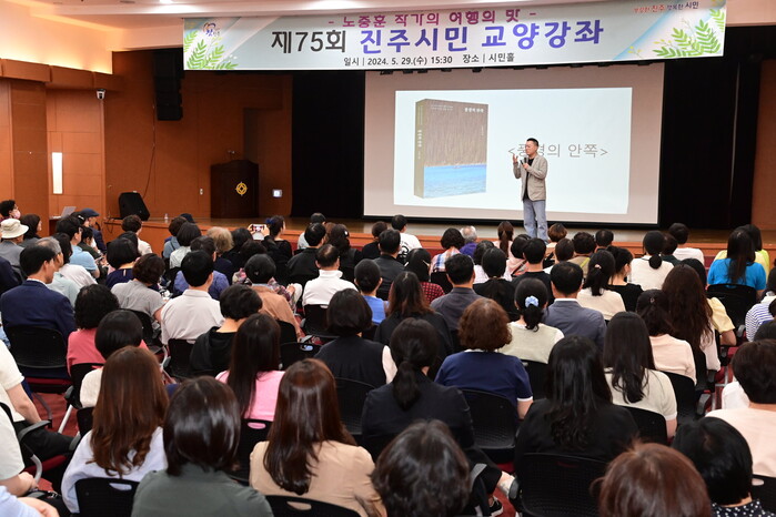 진주시는 29일 시청 시민홀에서 200여 명의 시민들이 참석한 가운데 노중훈 여행작가를 초빙해‘여행의 맛’이라는 주제로‘제75회 진주시민 교양강좌’를 개최했다.