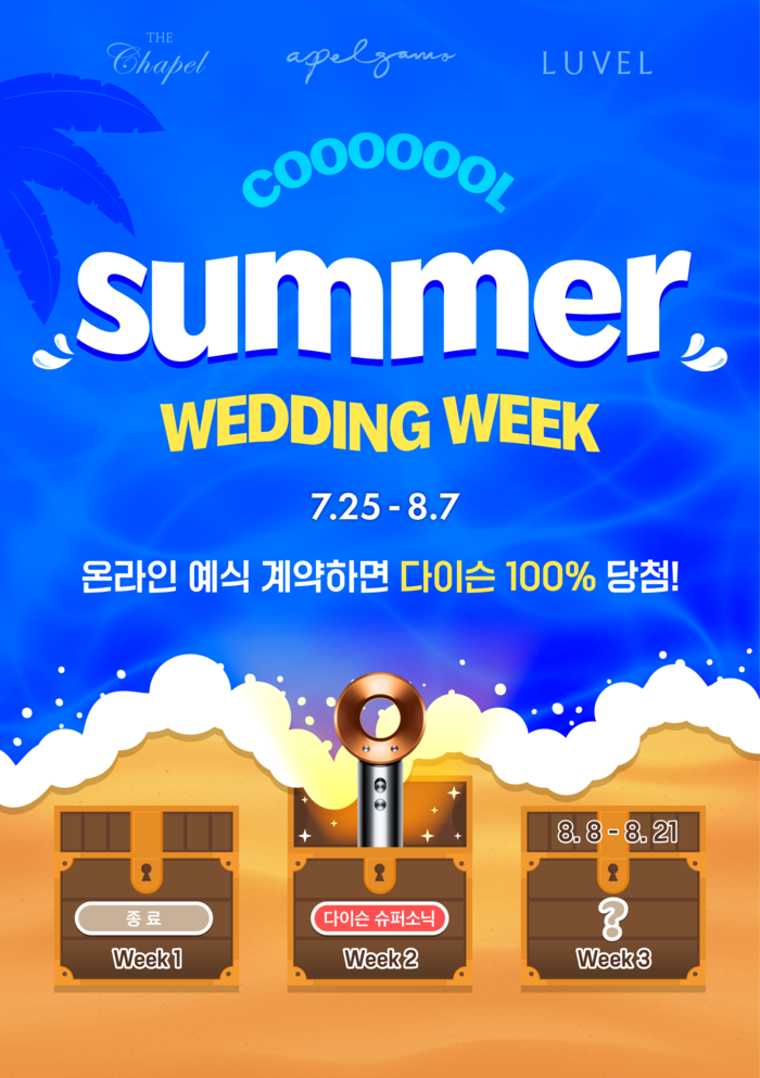 7월 25일부터 8월 7일까지 2주간 진행되는 '쿨 썸머 웨딩 위크' 2주차 기간에 온라인 예약을 할 경우, 다이슨 헤어드라이기가 제공된다.