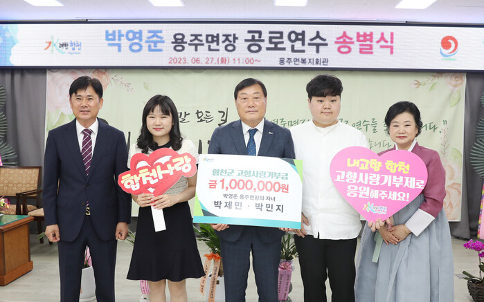 이날 박영준 용주면장은 교육발전기금 200만원을 기탁하였고 또한 남매는 고향사랑기부 후 받은 답례품(30만원 상당)을 다시 기부하여 가족이 어려운 시기에 따뜻한 나눔을 실천하여 훈훈함을 더했다. 이와 더불어 합천 고향사랑기부제의 제도 활성화를 기원하고 힘을 보태는 응원의 시간도 가졌다.