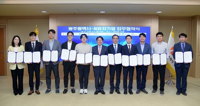 이날 협약식에는 강기정 시장을 비롯해 에이블클라우드 권민길 대표이사, 스마트라이드 이우영 대표이사, 루토닉스 문혁진 AI개발부장, 링커버스 박영준 대표이사, 아이클로 김준배 대표이사, 에듀템 신정훈 대표이사, 한국딥러닝 류석 기술이사, 미래아이티 임성훈 이사, 한테크 진언정 사업관리팀장, 엘렉센 김영일 전략기획본부장 등이 참석했다.