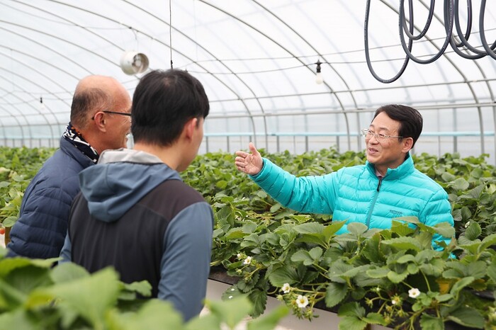 [강진=정찬남 기자] 전남 강진원 강진군수가 지난 17일 청년 농업인의 영농현장을 점검하고 애로사항을 듣기 위해 성전면과 강진읍에 위치한 딸기농장을 잇따라 방문했다.