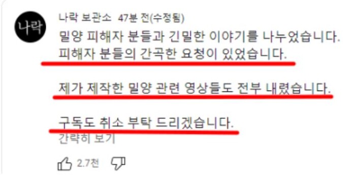 이와 관련해 유튜버 나락보관소가 게재했던 관련 모든 영상을 삭제한 것으로 전해지며 논란이 확산되는 상황이다.