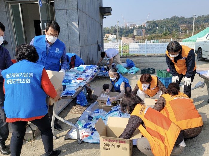 경기 양평군종합자원봉사센터는 ‘펭귄은 아이스를 사랑 海’ 아이스팩 재활용 프로그램을 진행한다. 수거·세척 등의 과정을 거친 재활용 아이스팩은 군청 및 읍·면사무소, 양평축협 등의 수요처에 전달돼 재사용될 예정이다. 사진은 최근 봉사자들이 수거된 아이스팩을 세척 및 포장하고 있는 모습. (사진제공=양평군청)