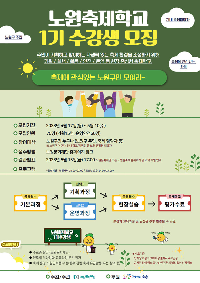 [시민일보 = 홍덕표 기자] 노원구(구청장 오승록)는 주민이 기획하고 참여하는 자생력 있는 축제환경을 조성하기 위해 '노원축제학교'를 운영하고 수강생을 모집한다고 24일 밝혔다.