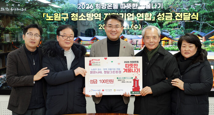 서울 노원구가 지난 21일 구청장실에서 '노원구 청소방역 자활기업 연합 성금 전달식'을 개최했다. 이날 전달된 성금 100만원은 지역내 취약계층을 위해 사용될 예정이다. 사진은 성금 전달식에 참석한 오승록 구청장(가운데)이 기념 촬영을 하는 모습. (사진=노원구청 제공)