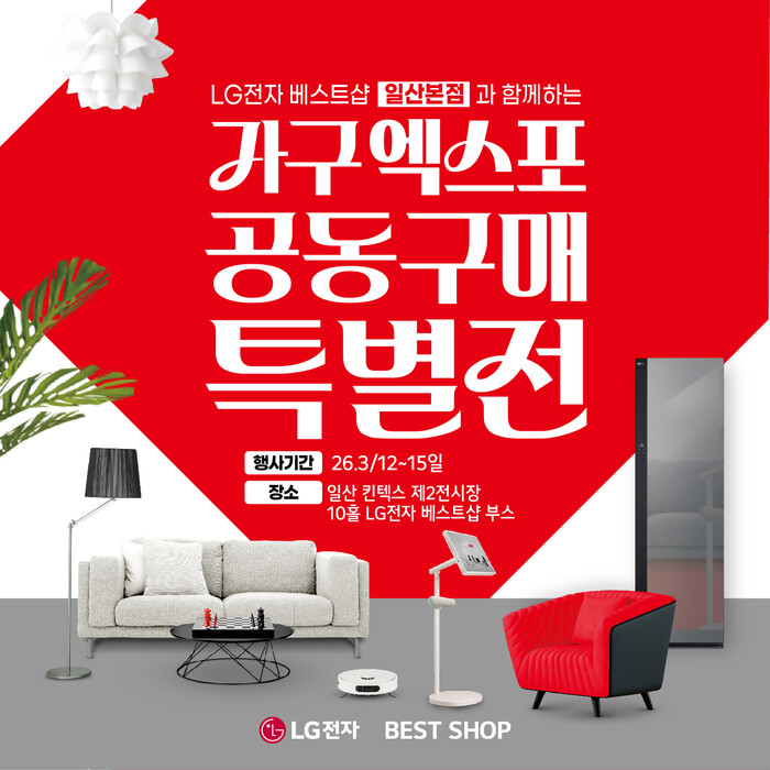LG전자 베스트샵 일산본점이 오는 3월 12일부터 15일까지 킨텍스 제2전시장 10홀에서 열리는 고양가구박람회와 연계해 ‘가구엑스포 공동구매 특별전’을 진행한다.