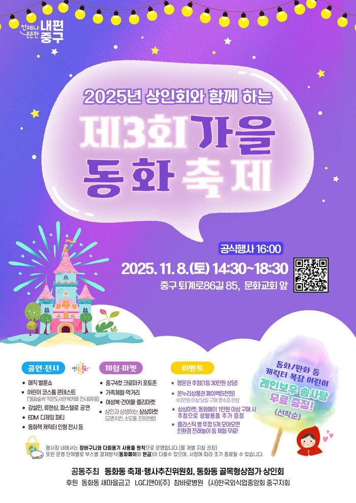 [시민일보 = 여영준 기자] 중구 동화동 문화교회(퇴계로86길 85) 일대가 오는 8일 오후 2시 30분부터 6시 30분까지 ‘제3회 상인회와 함께하는 가을동화축제’로 들썩인다.