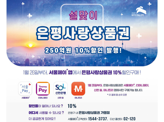[시민일보 = 이대우 기자] 은평구(구청장 김미경)가 오는 26일 오전 9시 설 명절을 맞아 250억 규모의 은평사랑상품권을 발행한다.