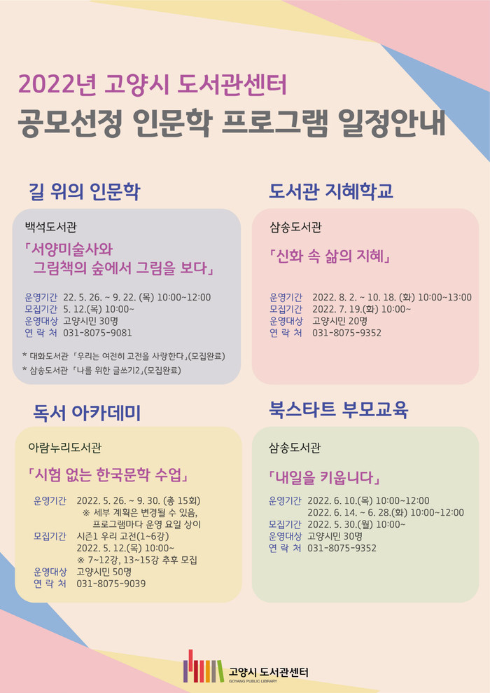 모집공고 및 프로그램 참여 신청 등 더욱 자세한 사항은 고양시 도서관센터 홈페이지에서 확인하면 된다.