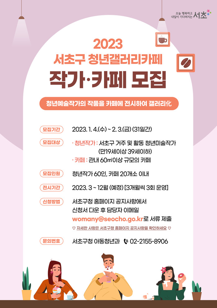 이를 위해 구는 ‘청년 갤러리카페 지원사업' 참여 작가와 동네 카페를 다음달 3일까지 공개 모집한다. 대상은 서초구에 주소지를 두거나 활동하는 만 19세 이상~39세 이하 청년 예술작가 60인이다.