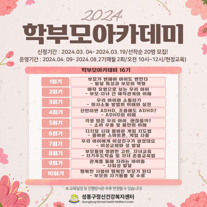학부모 아카데미에 참여하고자 하는 구민은 성동구정신건강복지센터 누리집 또는 전화로 신청할 수 있으며, 3월 19일까지 선착순 20명을 모집한다.