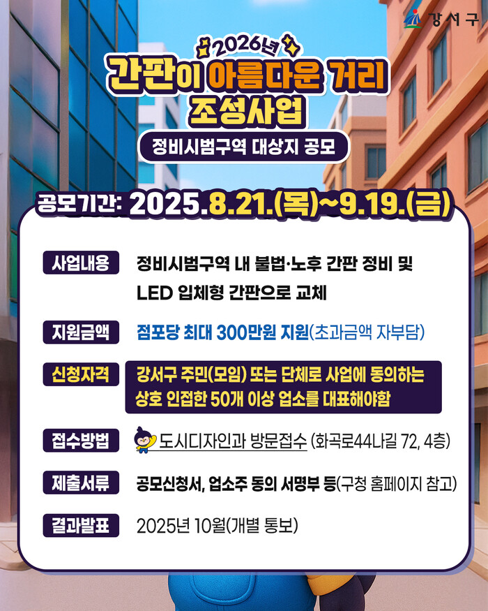 [시민일보 = 박소진 기자] 강서구(구청장 진교훈)는 간판이 아름다운 거리 조성을 위해 오는 19일까지 '2026년 간판개선사업' 참여 대상지를 공모한다고 밝혔다.