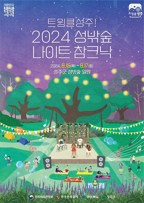 [성주=박병상 기자] 성주군은 야간관광 특화도시 조성사업의 일환으로 광복절 연휴인 오는 8월 15일(목)~17(토) 3일간 18:00~22:00까지 지역 대표 관광지인 성밖숲에서 「트윙클 성주! 2024 성밖숲 나이트 참크닉」행사를 개최한다.