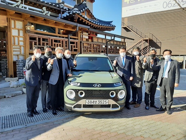 | ▲ 이용섭 광주광역시장(우측부터 네 번째)이 13일 지역산업계 대표자들과 간담회를 갖고 현장의 인력부족 등 지역산업 전반의 애로사항을 청취한 후 참석한 관계자 및 광주형 일자리 사업으로 생산된 캐스퍼 경승용차와 함께 기념 촬영을 하고 있다./광주광역시 제공 |