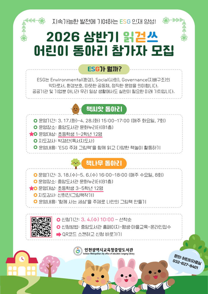 [인천=문찬식 기자] 인천광역시교육청중앙도서관(관장 임현자)은 어린이의 건강한 독서 습관 형성을 위하여 3월4일부터 어린이 독서 동아리 ‘책씨앗’과 ‘책나무’ 참여자를 모집한다.