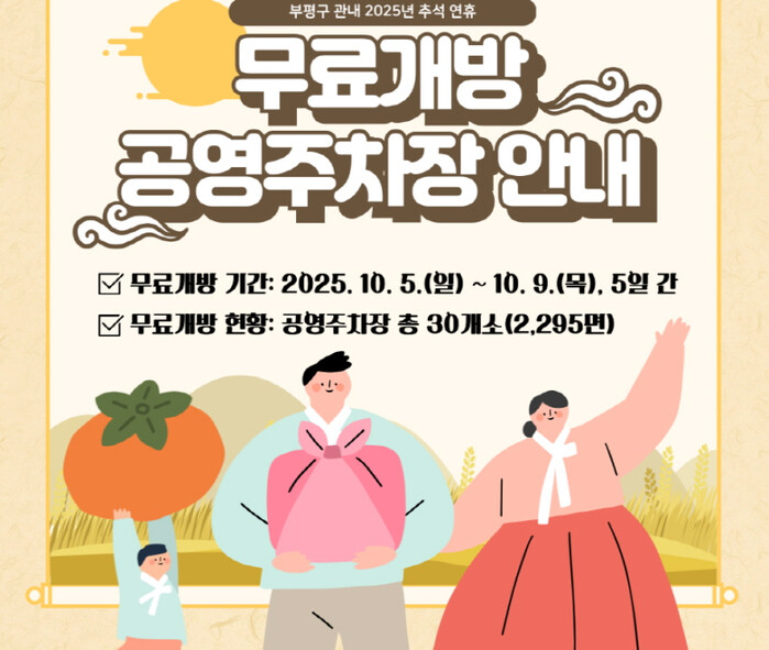 한편 부평시장, 부평시장대정, 부평깡시장, 삼산해돋이 건축물 주차장 등 일부 주차장은 무료 개방에서 제외되며 상세 개방 주차장 목록은 공단 통합주차 홈페이지 공지 사항을 통해 확인할 수 있다.