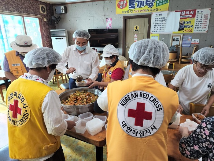 대한적십자사 경기 포천지구 화현봉사회는 최근 소외계층을 돕기 위한 ‘희망의 삼계탕’ 나눔행사를 진행해 삼계탕 50인분·제육볶음 50인분을 비롯해 화현면에서 생산되는 오이·콩나물 등 채소와 간식거리를 홀몸노인 등 소외계층 50가구에 전달했다. 사진은 행사에 방문한 백영현 시장(왼쪽 두 번째)이 음식 준비를 돕고 있는 모습. (사진제공=포천시청)