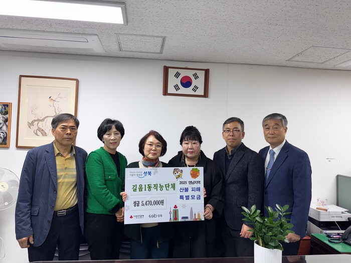 [시민일보 = 문민호 기자] 성북구(구청장 이승로) 길음1동(동장 정재환)의 직능단체들이 최근 산불로 큰 피해를 입은 영남지역 주민들을 돕기 위해 마음을 모았다. 이들은 총 547만 원의 성금을 모아 전달하며 이재민들에게 작은 위로와 희망을 전했다.