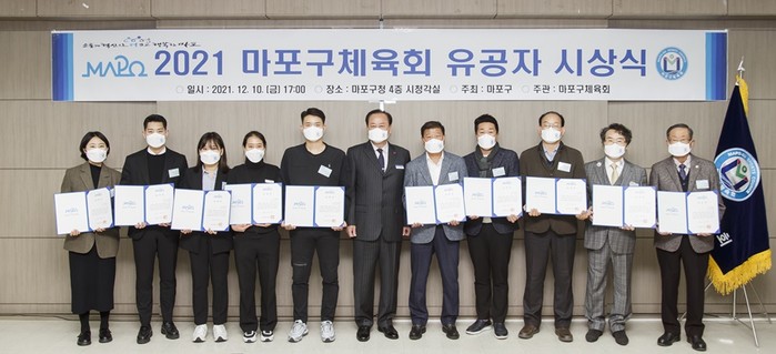 서울 마포구는 마포구체육회 주관으로 지난 10일 마포구체육회 유공자 표창 시상식을 열고 구 체육 발전에 공헌한 유공자 10명에게 표창을 수여했다. 사진은 시상식에서 유동균 구청장(가운데)이 수상자들과 기념촬영을 하고 있는 모습. (사진제공=마포구청)