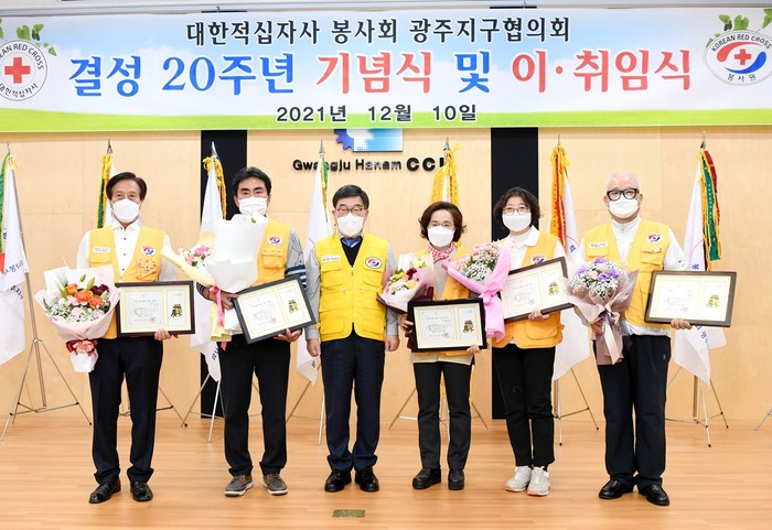 대한적십자사봉사회 경기광주시지구협의회는 최근 ‘봉사단 결성 20주년 기념 및 이·취임’ 행사를 개최해 제10대 채주병 회장에 이어 제11대 최문희 회장이 취임했다. 사진은 행사에서 신동헌 시장(왼쪽 세 번째)과 관계자들이 기념촬영을 하는 모습. (사진제공=광주시청)