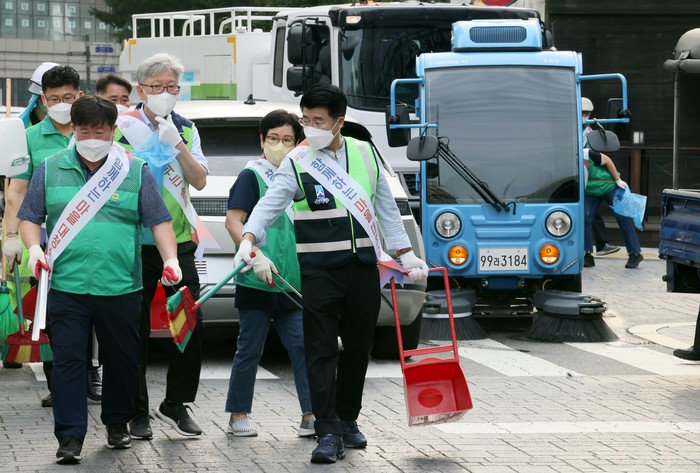 서울 송파구는 20일 미세먼지와 묵은 때를 벗겨내는 ‘주민과 함께하는 마을 대청소’를 구청과 각 동주민센터에서 대대적으로 진행했다. 구는 물청소차 6대, 먼지흡입차 8대 등 청소장비를 총동원해 도로 및 버스정류장, 지하철입구 등 각종 공공시설물을 세척했다. 사진은 이날 서강석 구청장(오른쪽)이 주민들과 방이맛골에서 마을 대청소를 하고 있는 모습. (사진제공=송파구청)
