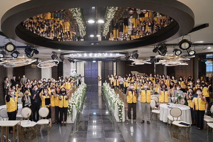 충남 아산시 어린이집연합회가 31일 자원봉사단 발대식을 개최했다. 아산시 어린이집연합회 자원봉사단은 보육 교직원으로 구성돼 나눔을 실천하고, 시간과 재능을 활용해 지역사회에 힘을 보태기 위해 조직됐다. 사진은 발대식에서 박경귀 시장(왼쪽 세 번째)이 자원봉사단과 단체 기념촬영을 하는 모습. (사진제공=아산시청)