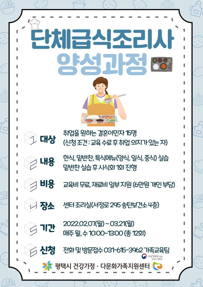 ‘단체급식조리사양성과정’은 취업을 원하는 관내 결혼이민자 15명을 대상으로 오는 2월 7일부터 3월 21일까지 취업을 위한 한식, 밑반찬, 특식메뉴(양식, 일식, 중식) 실습을 12회 진행하며, 실습을 통해 만든 메뉴로 시식회를 1회 실시하고, 교육수료 후 취업연계를 할 예정이다.