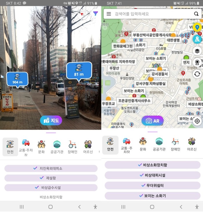 또한 앱상의 AR버튼을 눌러 증강현실 모드로 진입하면 카메라를 통해 주변 시설물들의 정보를 더욱 실감나게 알아볼 수 있는 장점도 있다.