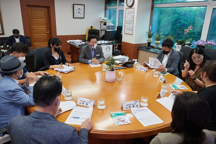충남 아산시는 5일 지역내 장애인단체 대표 10인과 간담회를 진행했다. 이날 간담회는 박경귀 시장의 주요 공약 중 하나인 ‘장애인이 살기 좋은 무장애 도시 아산 만들기’ 정책 추진을 위해 정책 당사자들의 목소리를 청취하기 위해 마련됐다. 사진은 간담회에서 박 시장(가운데)과 장애인단체 대표들이 대화를 하고 있는 모습. (사진제공=아산시청)