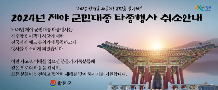 김윤철 군수는 “이번 사고로 피해를 입으신 분들과 유가족분들게 깊은 위로의 마음을 전한다.”며 “모든 분들이 안전하고 평안한 새해를 맞이 하시기를 기원한다.”고 말했다.