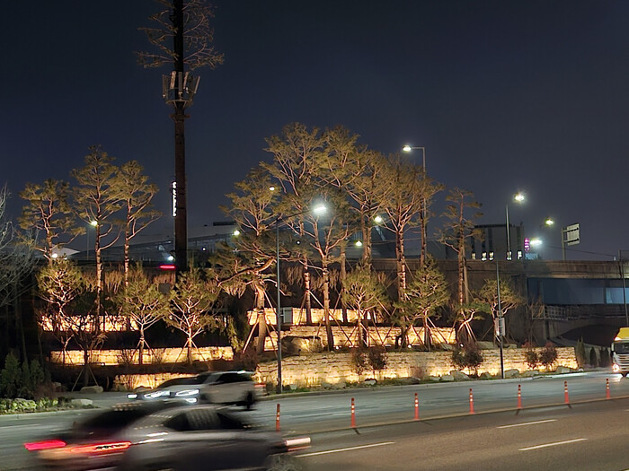 야간에는 성곽돌과 장송을 비추는 경관조명을 통해 낮과 밤 모두 송파의 품격이 느껴지는 환영의 정원으로 꾸며졌다. 잠실대교 남단 구간 역시 기존 잡초와 잡목을 정비하고, 바윗돌과 어우러진 소나무 군락을 조성해 자연미를 살린 경관으로 탈바꿈했다.