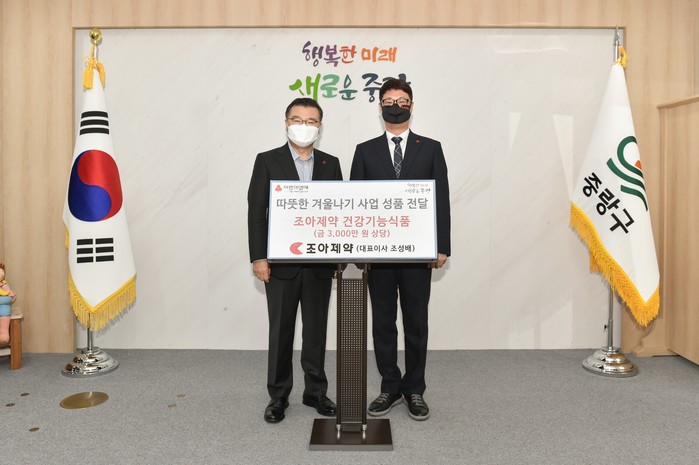 서울 중랑구 망우3동 주민센터는 최근 (주)조아제약으로부터 희망온돌 따뜻한 겨울나기 성품으로 3000만원 상당의 건강기능식품과 의약외품 등을 전달받았다. 이날 전달받은 성품은 지역내 저소득 가구에 전달될 예정이다. 사진은 류경기 구청장(왼쪽)과 조성배 대표가 기념촬영을 하는 모습. (사진제공=중랑구청)