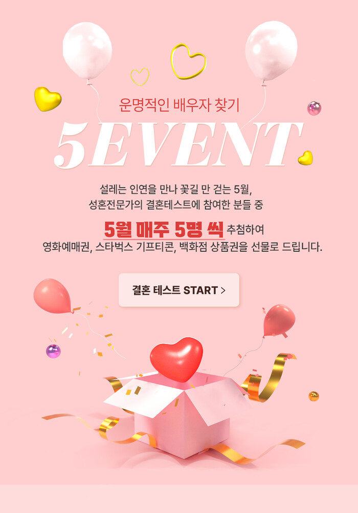 이번 스폐셜 결혼이벤트는 5월 31일까지 진행되며 노블레스 디노블 결혼사이트 이벤트 페이지에서 성혼전문가의 결혼테스트에 참여한 분들 중 5월 매주 5명씩 선착순으로 추첨하여 cgv영화예매권, 스타벅스 커피쿠폰, 백화점 상품권을 선물로 증정할 예정이다.