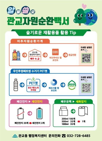 ‘알뜰쓸모 관교자원순환백서’는 현재 관교동 누리집에 게시 중이며 행정복지센터에 방문하면 누구나 받을 수 있다.