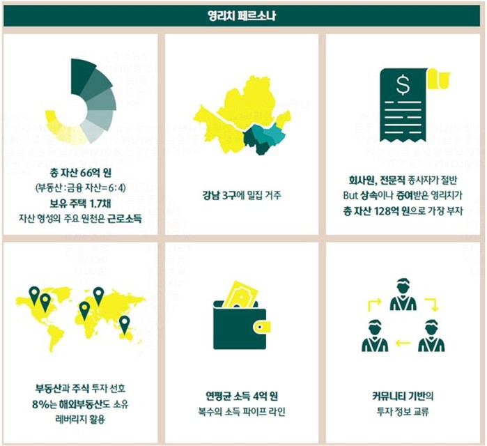 영리치는 회사원이 30%로 가장 많지만 의료, 법조계 전문직이 20%로 동일 연령대의 일반 대중보다 그 비율이 6배 이상 높다. 지난해 영리치의 수익률에 가장 긍정적 영향을 준 자산은 부동산으로, 같은 연령대의 일반 대중은 주식이라고 응답한 점과 대조를 이룬다.