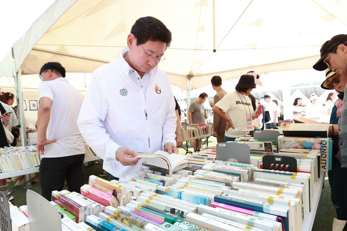 | ▲ 이상일 용인특례시장이 9일 열린 북페스티벌에서 도서관 제적도서를 1000원에 파는 '북 세일' 부스를 방문해 시민들과 함께 도서를 살펴보고 있는 모습 |