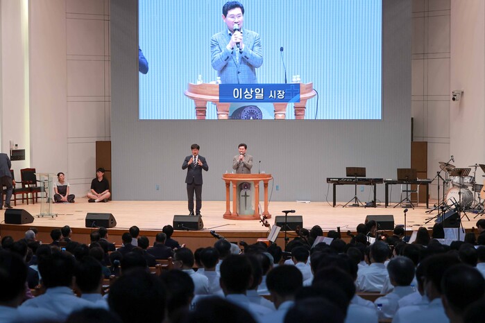 | ▲ 이상일 용인특례시장이 8월 27일 총신대학교에서 열린 용인기독교총연합회 기도대성회에 참석해 축사를 하고 있다 |