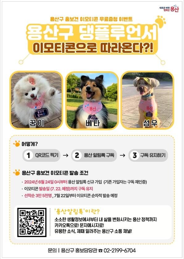 박희영 구청장은 “용산 알림톡은 다양한 구정 소식을 손쉽게 받아볼 수 있는 홍보 매체”라며 “이번에 용산구 홍보견 이모티콘 이벤트가 알림톡 구독자를 늘리고 친근한 구정 이미지를 만드는 데도 도움이 되길 기대한다”고 전했다.
