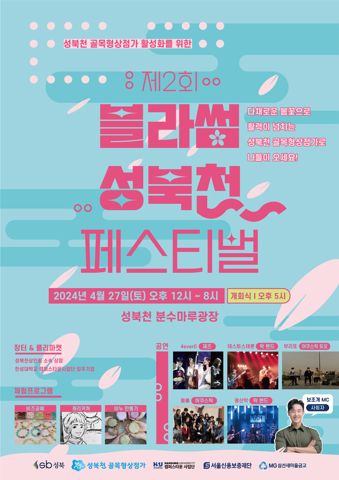 [시민일보 = 변은선 기자] 성북구(구청장 이승로)와 성북천 골목형상점가 상인회가 오는 27일 성북천 분수마루에서 '제2회 블라썸 성북천 페스티벌'을 개최한다고 밝혔다.