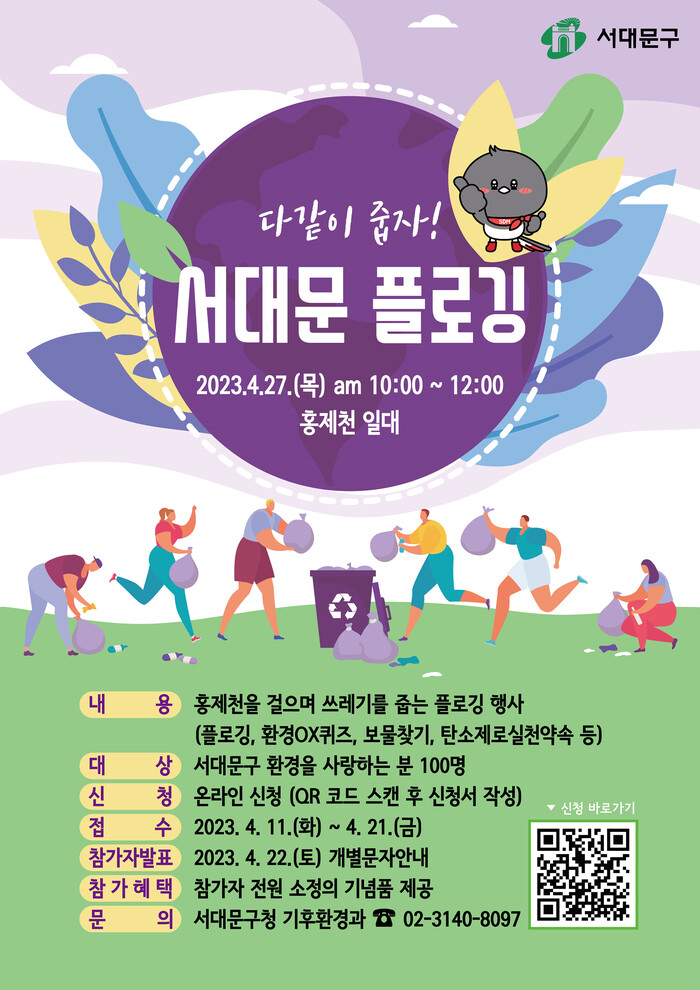 [시민일보 = 홍덕표 기자] 서울 서대문구(구청장 이성헌)가 오는 27일 폭포마당 등 홍제천 일대에서 '다같이 줍자! 서대문 플로깅'을 개최한다.