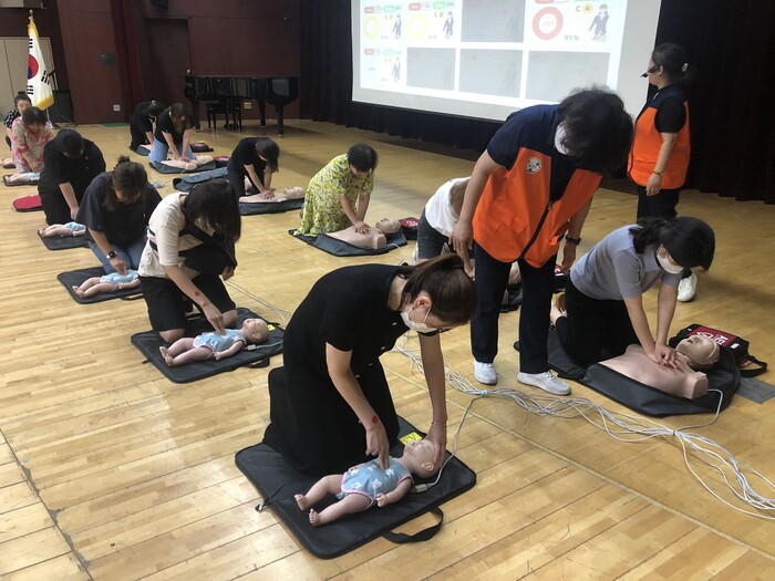 | ▲ 어린이이용시설 종사자 안전교육 중 심폐소생술 실습 진행 모습. (사진=동대문구청 제공) |