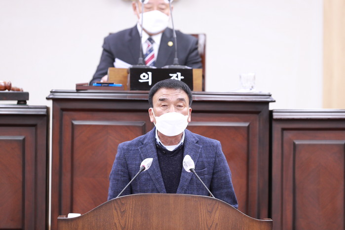 | ▲ '의료폐기물 소각시설 의령군 설치 반대 성명서'를 대표 발의하고 있는 김규찬 부의장. (사진제공=의령군의회) |