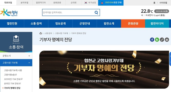온라인 명예의 전당은 100만원 이상 고액 기부자를 대상으로 기부자의 이름과 금액이 게시돼 있으며, 25일 기준 합천군 고향사랑기부제 참여자는 983명으로 100만원 이상 고액기부자는 65명이다.