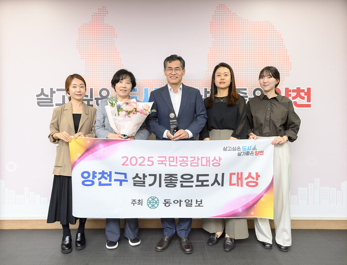 양천구가 최근 <동아일보>에서 주최한 ‘국민공감대상’에서 ‘살기좋은 도시’부문과 제10회 지역·사회발전공헌대상 ‘사회갈등해소’ 부문에서 연이어 대상을 수상했다. 사진은 이기재 구청장(가운데)과 구 관계자들이 수상을 기념해 단체 촬영을 하는 모습. (사진=양천구청 제공)