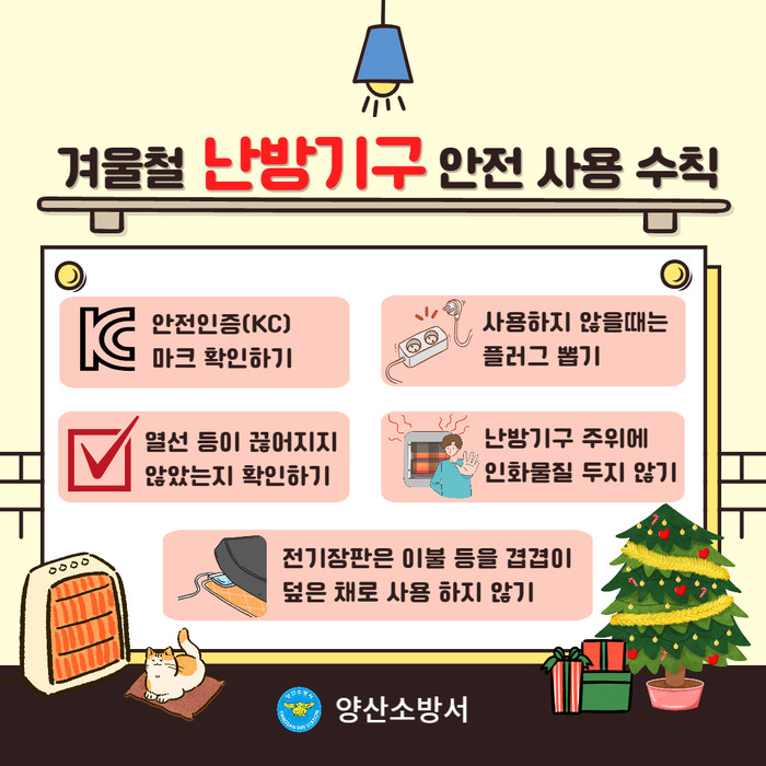 소방서는 안전한 겨울용품 사용을 위해 ▲안전인증(KC마크) 제품 확인 및 사용 ▲문어발식 전기콘센트 사용금지 ▲누전차단기 정상 작동 여부 확인 ▲가연물질 인근에서 사용 금지 등을 다방면으로 홍보하고 있다.